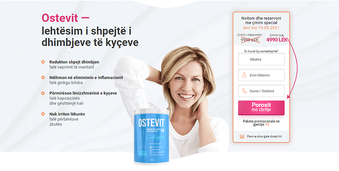 Ostevit është një suplement ushqimor efektiv për dhimbjet e kyçeve dhe tani është i disponueshëm në Albania & Kosovo. Nga rishikimi më poshtë, do të jeni në gjendje të kuptoni gjithçka që lidhet me: Çfarë është Ostevit — vetitë dhe përfitimet e ilaçit? Cilat janë komentet dhe opinionet më të njohura të përdoruesve? Si të merrni pluhurin — udhëzime për përdorim? Sa kushton — çmimi Ostevit dhe ku mund ta blini?